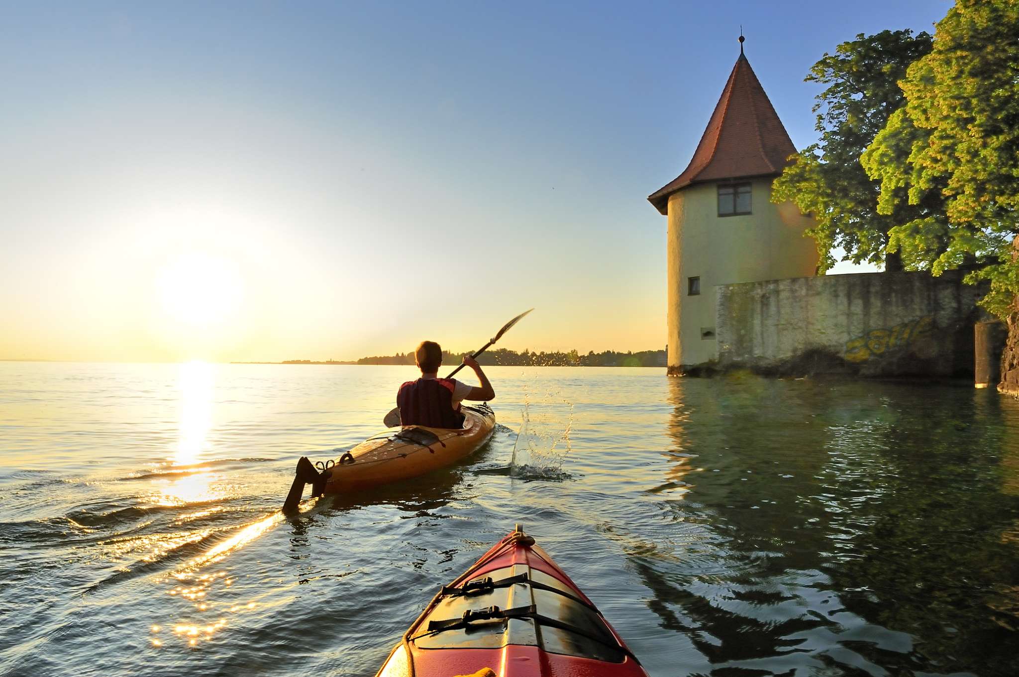 Es gibt kaum einen schöneren Weg den Bodensee mit seiner einzigartigen Natur- und Kulturlandschaft zu entdecken als paddelnd vom Wasser aus. La Canoa, das Kanuzentrum in Konstanz, rüstet Wasserbegeisterte aus mit Paddel-Equipment und bietet ein vielfältiges Kursangebot und Routenvorschläge. Wie wäre es zum Beispiel beim Aufenthalt am Bodensee bis zur Unterkunft mit dem Kanu zu paddeln? Oder den Bodensee-Kanuweg unter die Ruder zu nehmen? 25 Abgabestationen rund um den Bodensee machen diese etwas andere Art des Reisens möglich. Auf Schweizer Bodenseeseite finden sich SUP- und Kanustationen in Romanshorn, Kreuzlingen, Gottlieben, Steckborn, Stein a.R., Schaffhausen. Hier können Boote und SUP's gemietet und abgegeben werden. Für Gruppen-, Schulklassen-, Firmen- und Teambuildingausflüge bietet La Canoa geführte Kanutouren an. Das gemeinsame Fortbewegen auf dem Wasser stärkt den Zusammenhalt, denn nur mit vereinten Kräften gelangt man ans Ziel. Ein spritziger und erlebnisreicher Tag ist garantiert.