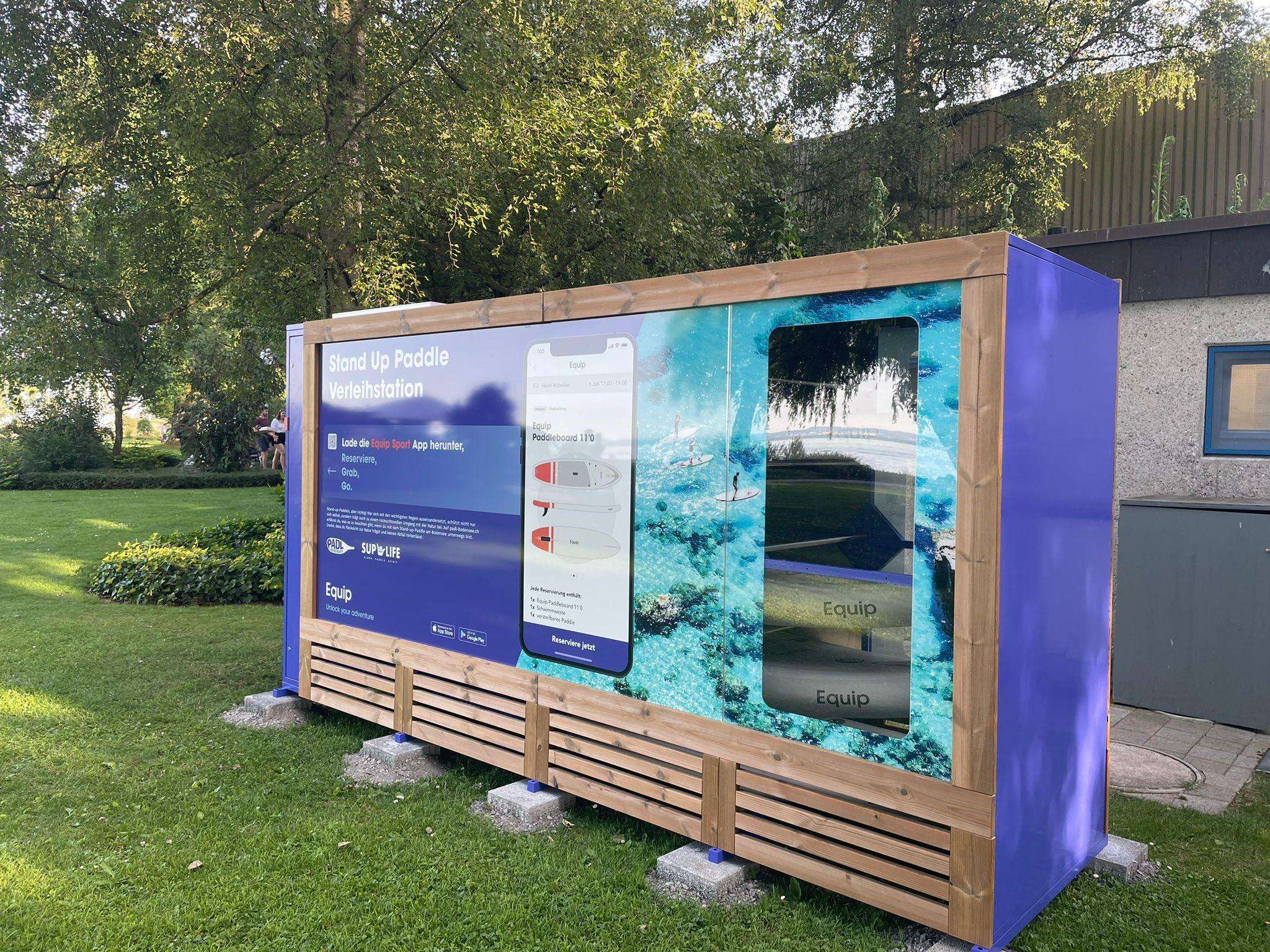 Die selbstbedienbare SUP-Mietstation in Romanshorn liegt direkt im Seepark zwischen dem Bootshafen und dem Strandbad. Die Mietstation kann per App gebucht und bedient werden.